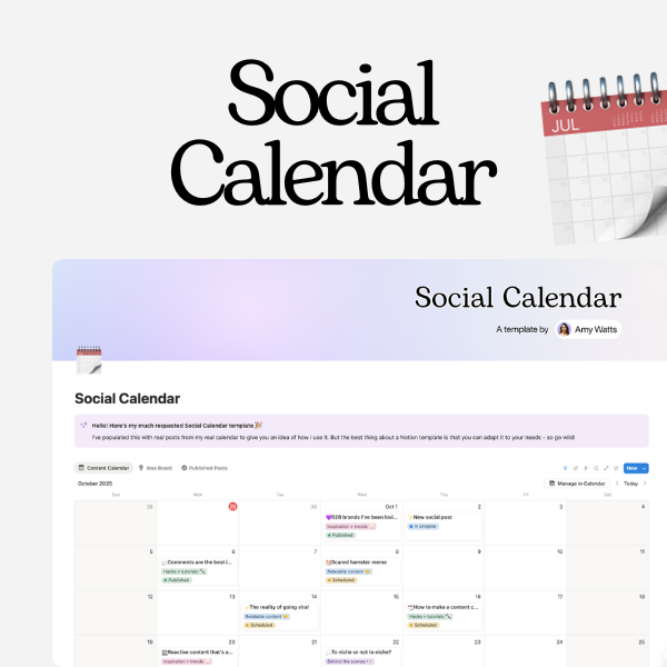 Hi, I'm Amy 👋 A SaaS marketer, wearer of many hats, and Notion fanatic. After my own setup went viral, I started creating templates to help other busy marketers feel more organised and find the joy in beautiful, colour-coded Notion databases 💜